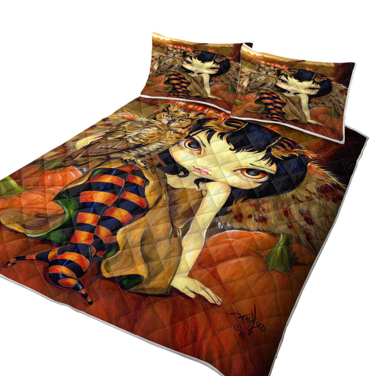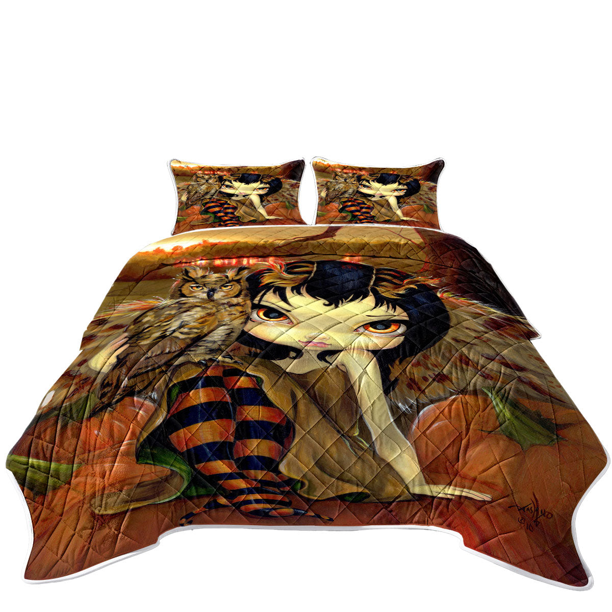 The Owl Fairy Owlyn in Autumn Sitting on Pumpkins Quilt
