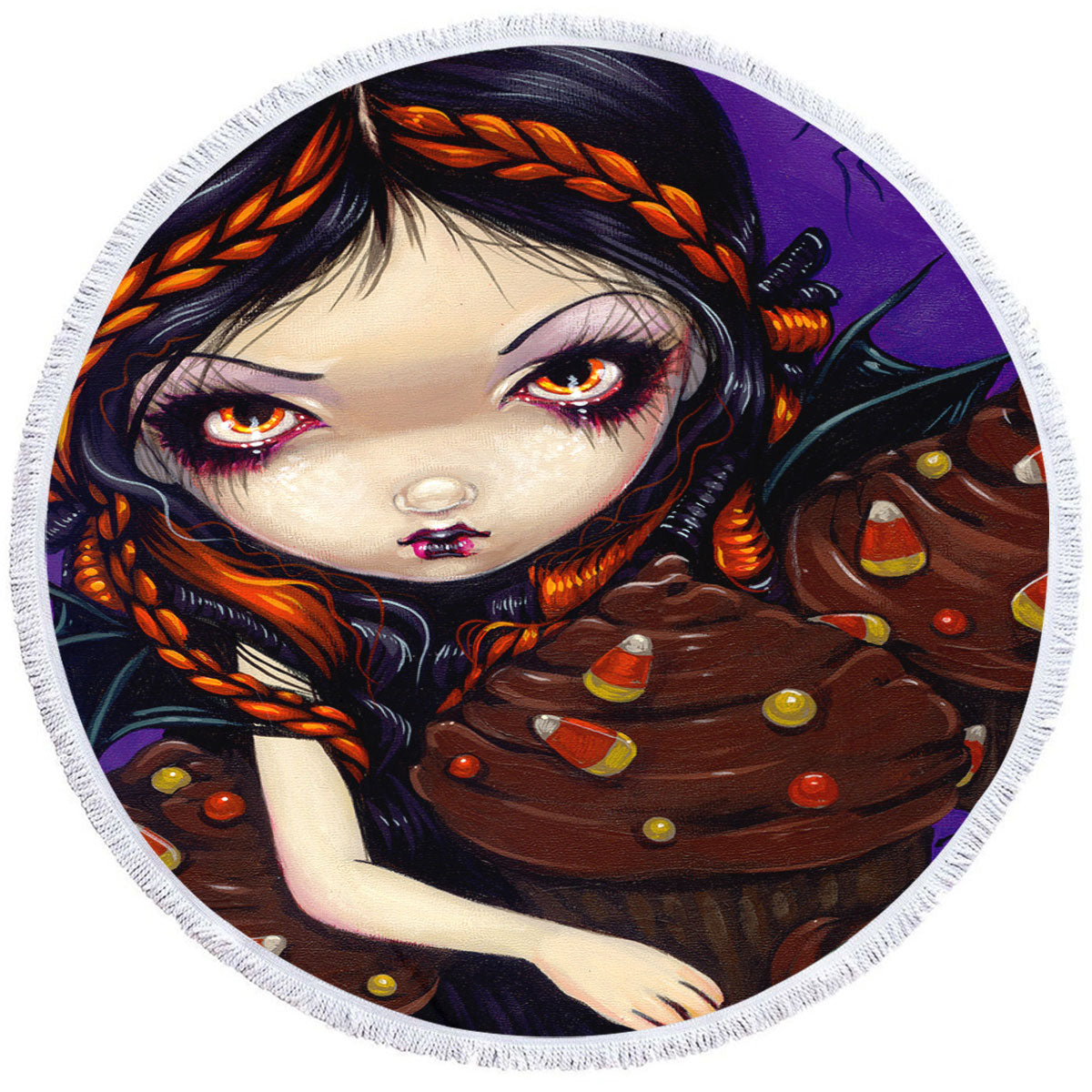 Bat Winged Fairy with Halloween Cupcakes Round Beach Towel