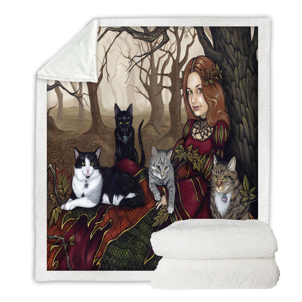 The Autumn Maiden Karen and Her Cats Throw Blanket