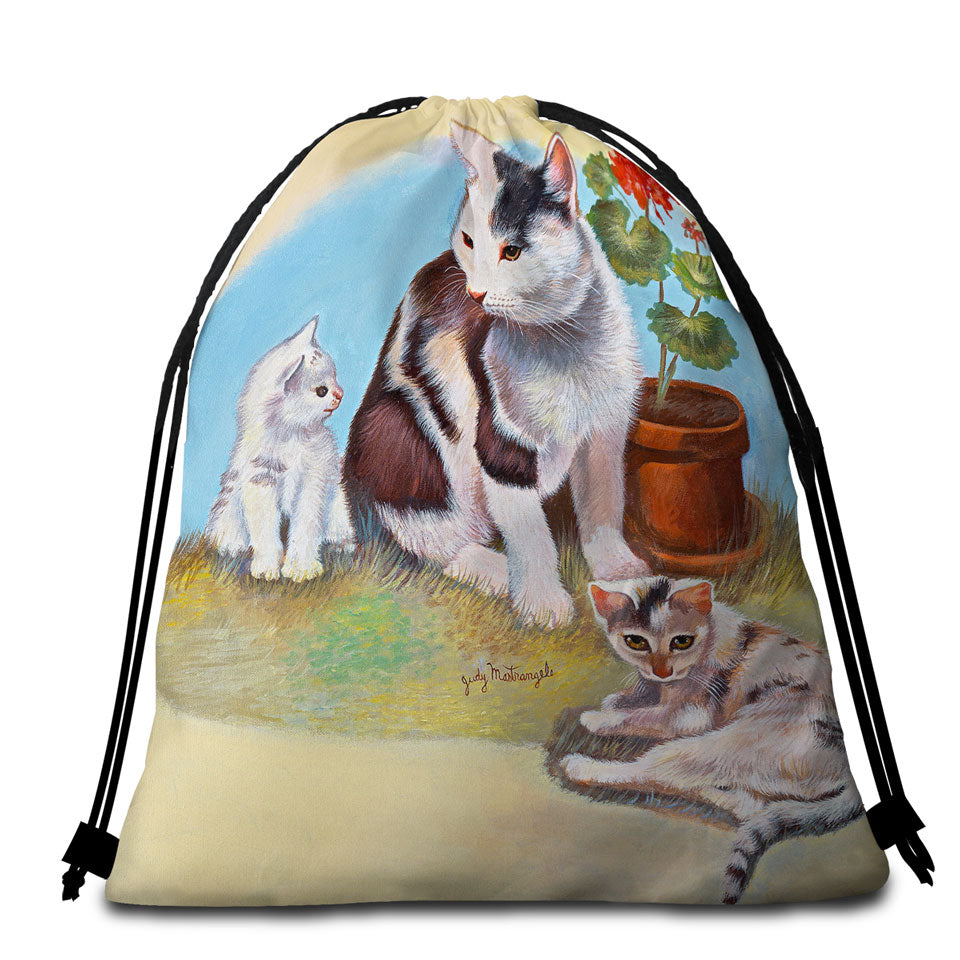 Lovey Cat Art Painting Momma Cat and Kittens Round Beach Towel