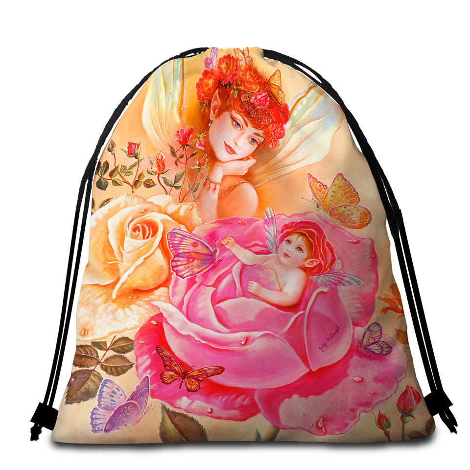 Roses Fairy and Her Baby Painting My Little Rosebud Round Beach Towel