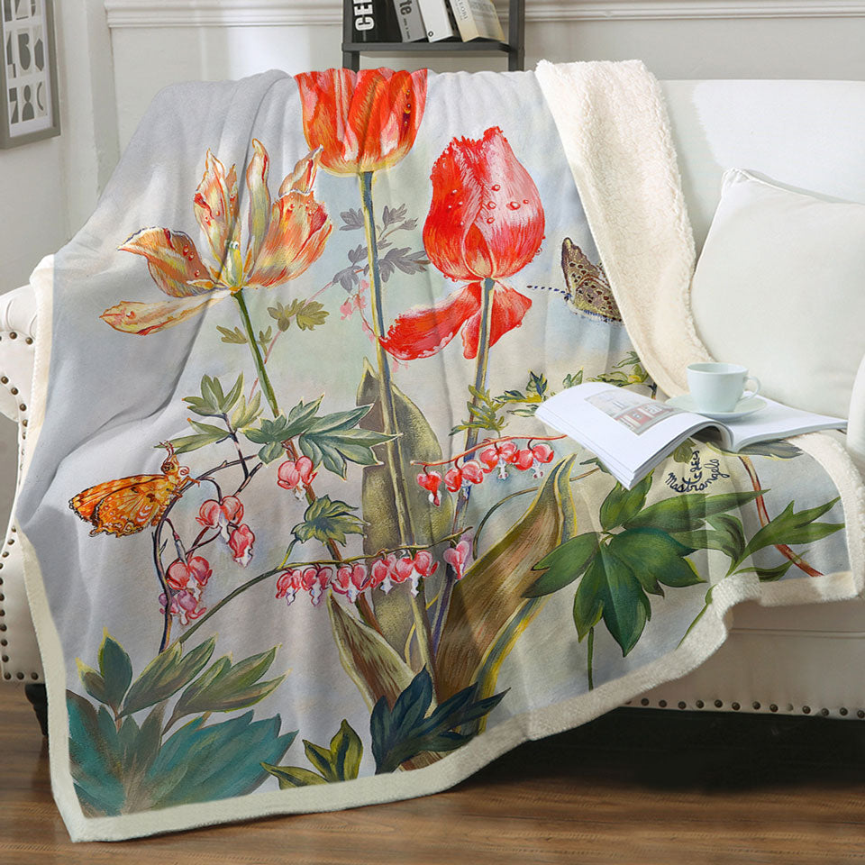 Butterflies and Flowers Art Bleeding Hearts and Tulips Throw Blanket