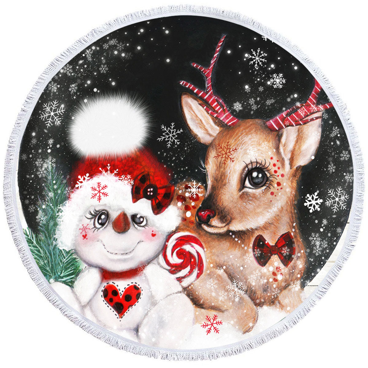 Adorable Christmas Reindeer and Snowman Round Beach Towel