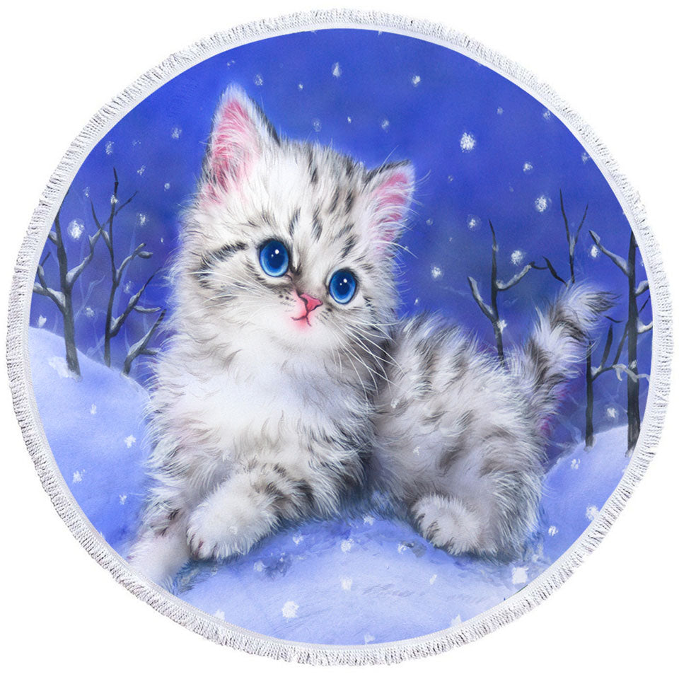 Baby Blue Eyes Grey Kitten on Snow Hill Round Beach Towel
