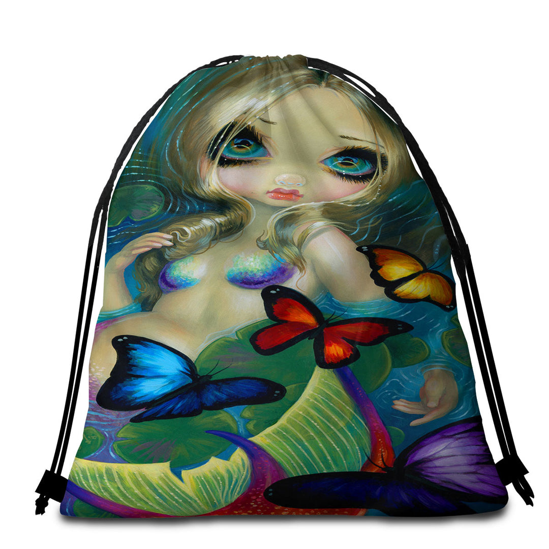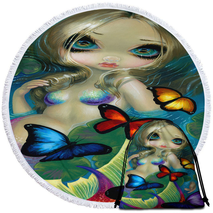 Colorful Fantasy Mermaid with Butterflies Round Beach Towel