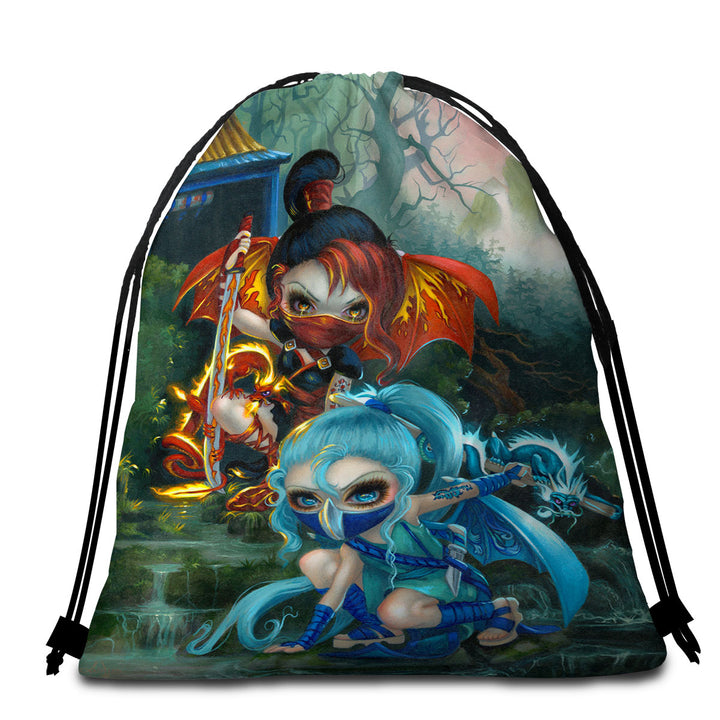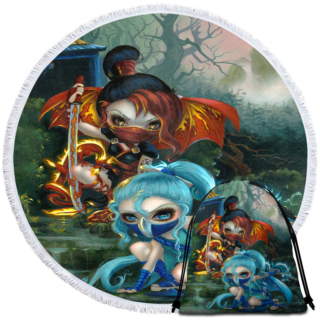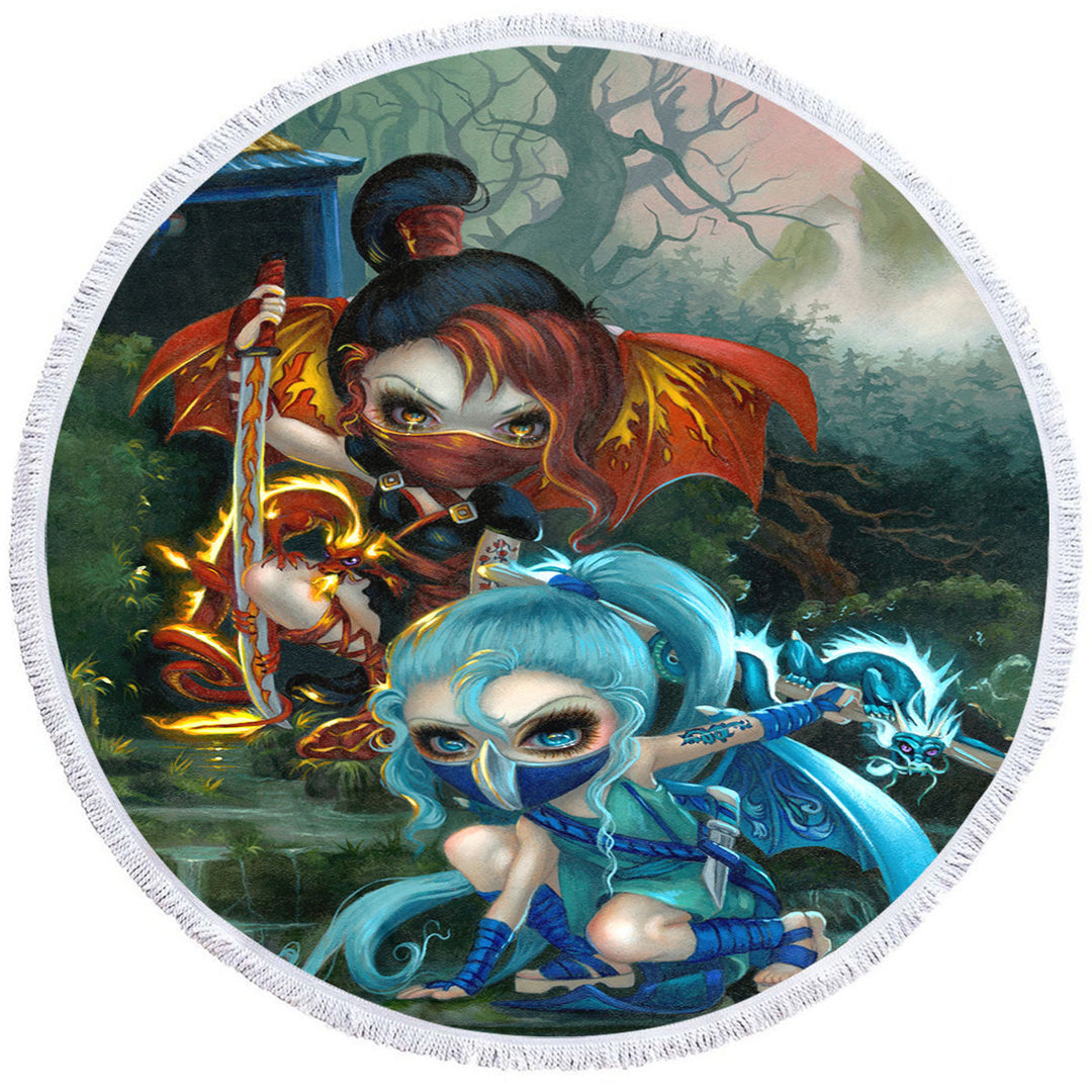 Cool Ninja Dragonlings Fire and Water Ninjas Round Beach Towel