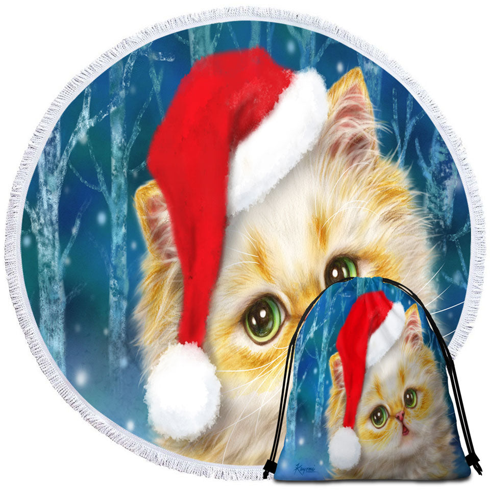 Cute Christmas Cat Design Ginger Santa Kitten Round Beach Towel