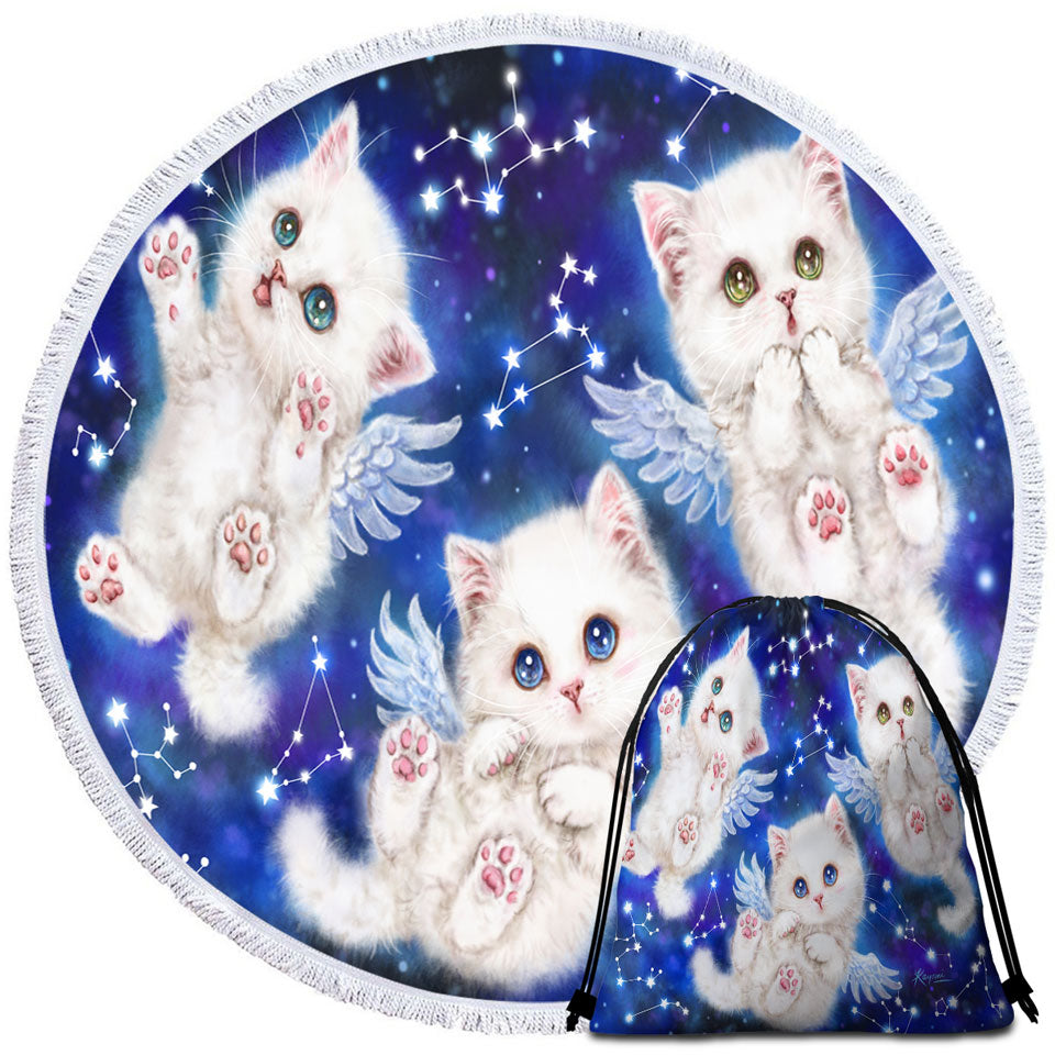 Cute Star Angels White Kitty Cats in Space Round Beach Towel