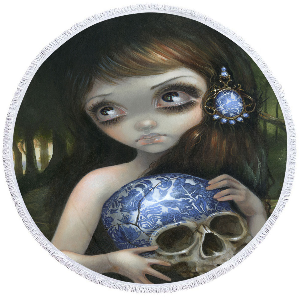 Dark Art Girl with Porcelain Blue Willow Skull Round Beach Towel