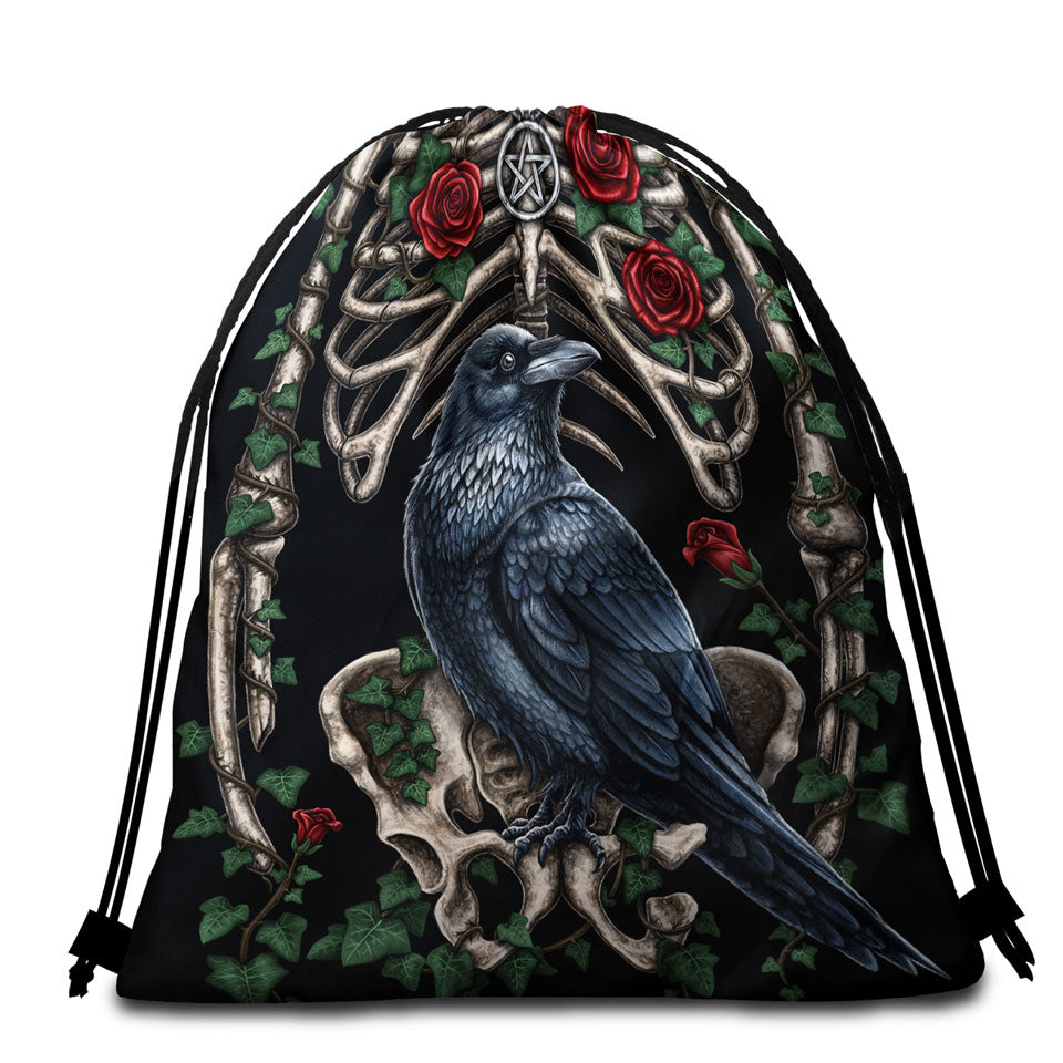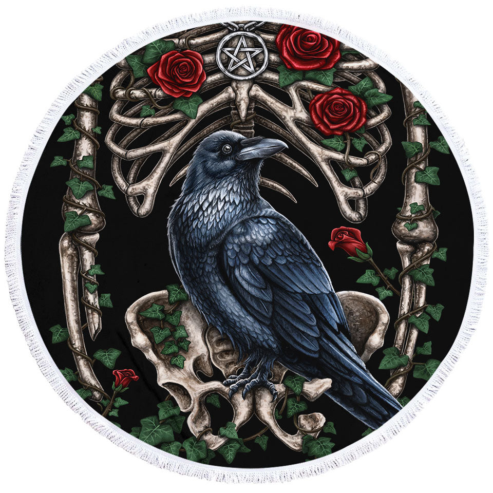 Dark Art Roses Human Skeleton and Crow Round Beach Towel
