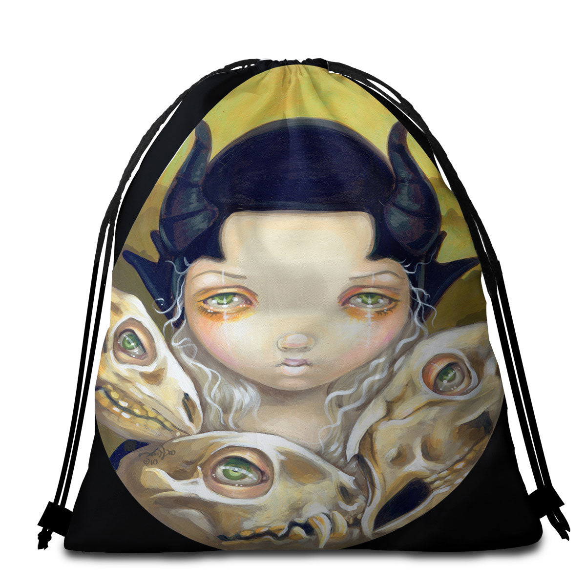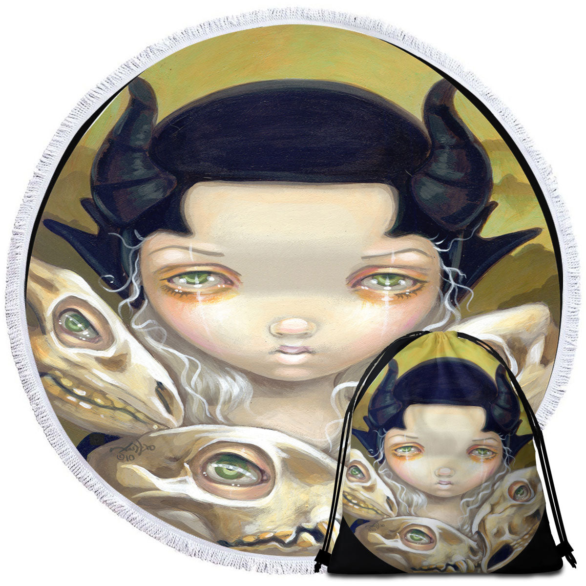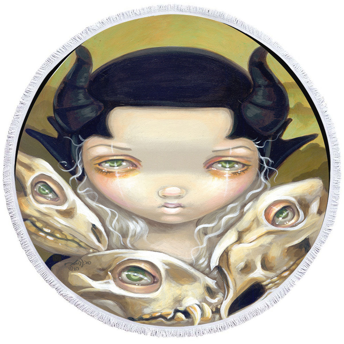 Dark Medieval Art Girl and Skulls Delicate Bones Round Beach Towel