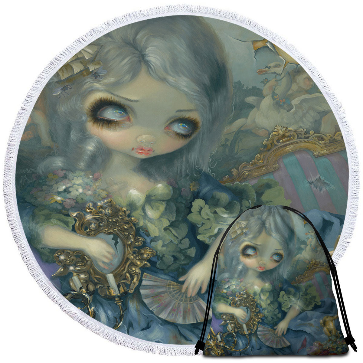 Purchase a round beach towel that features unique artwork.