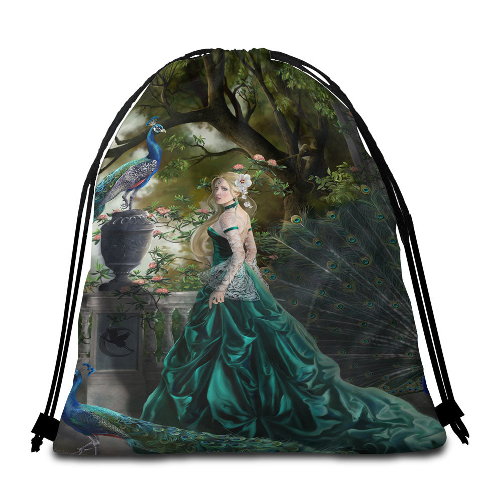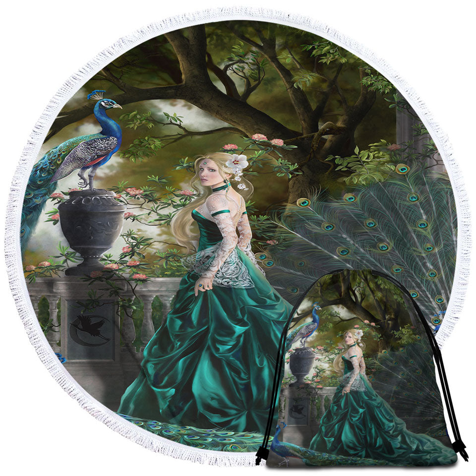 Emerald Fantasy Peacocks and Princess Round Beach Towel