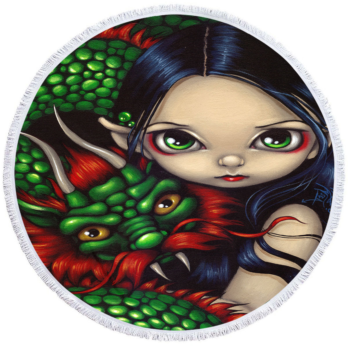 Emerald Guardian Elf Maiden and Her Chinese Dragon Round Beach Towel