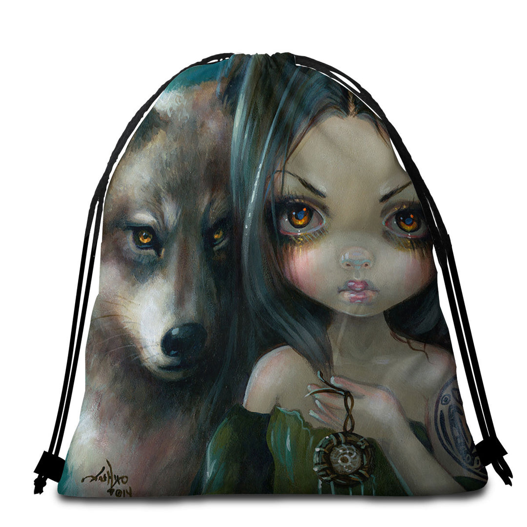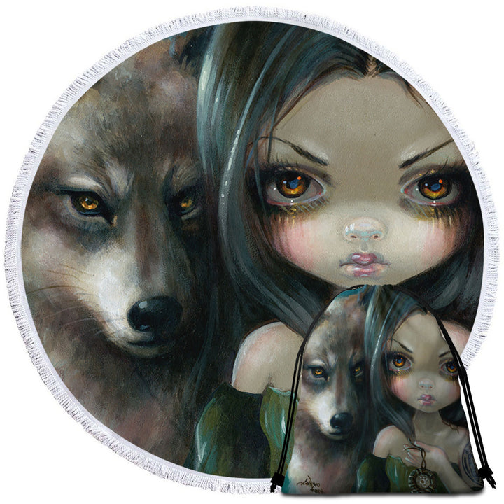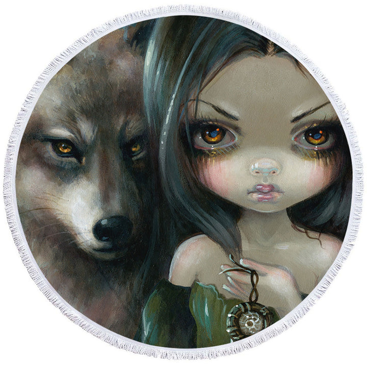 Faces of Faery #226 Native Goth Girl with Her Wolf Round Beach Towel