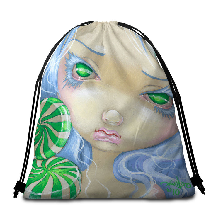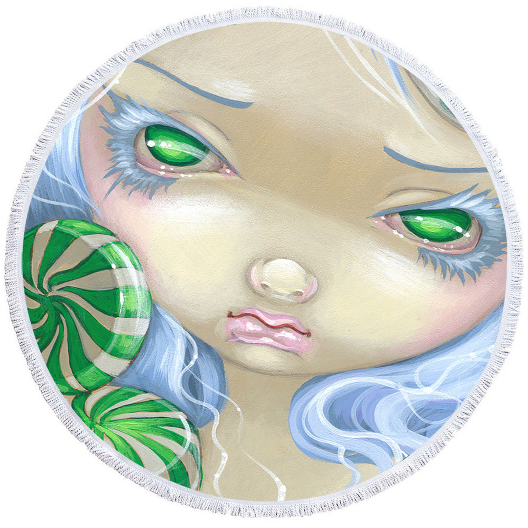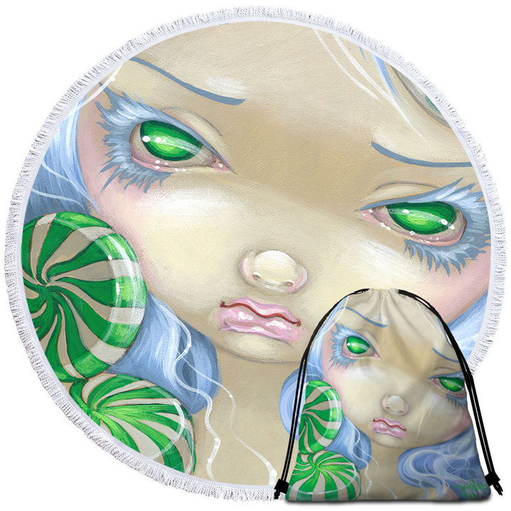 Faces of Faery #85 Green Girl with Peppermint Candy Round Beach Towel