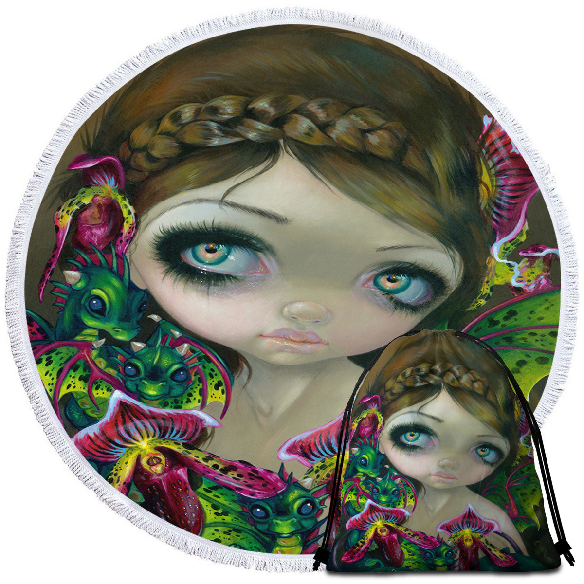 Fantasy Art Beautiful Fairy and Dragon Orchid Round Beach Towel