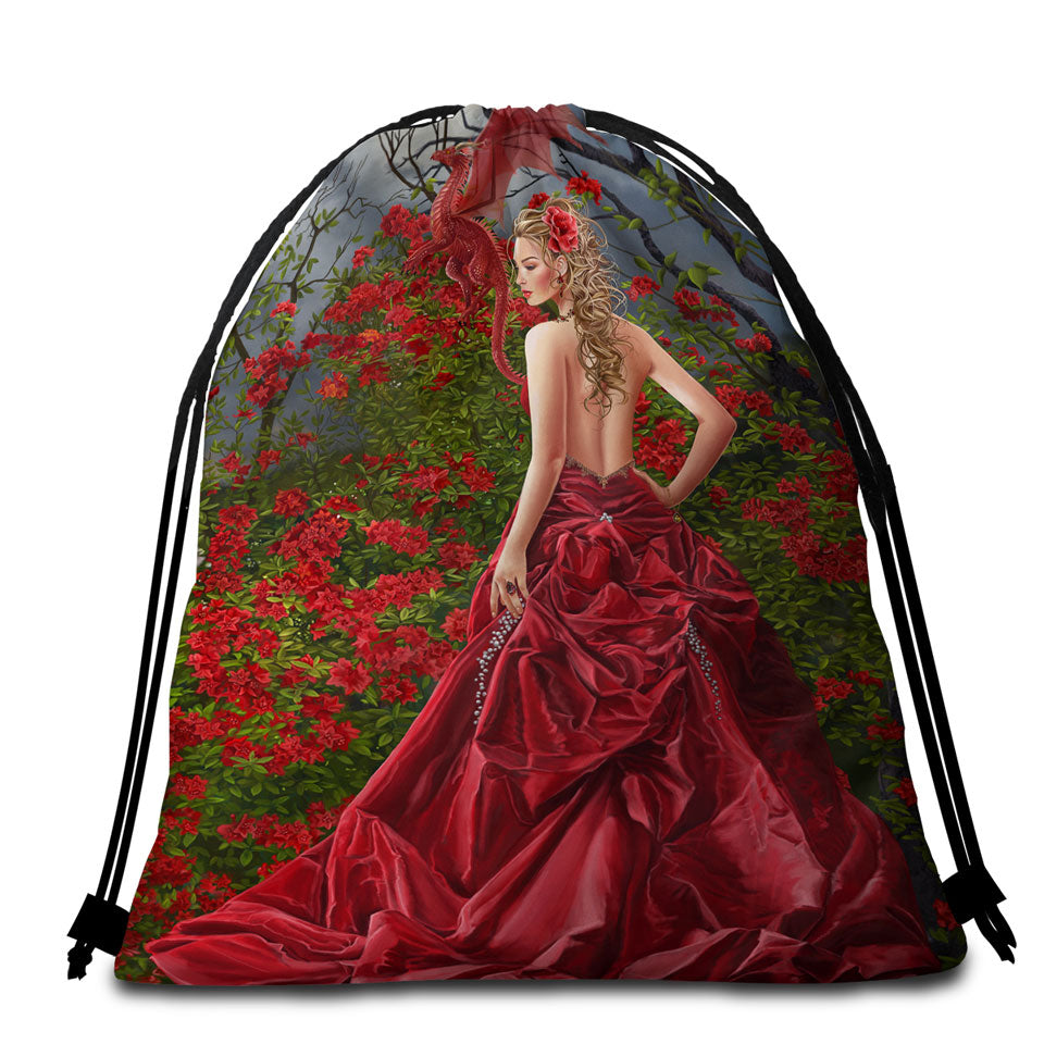 Fantasy Art Beautiful Circle Beach Towel Red Dressed Woman and Dragon