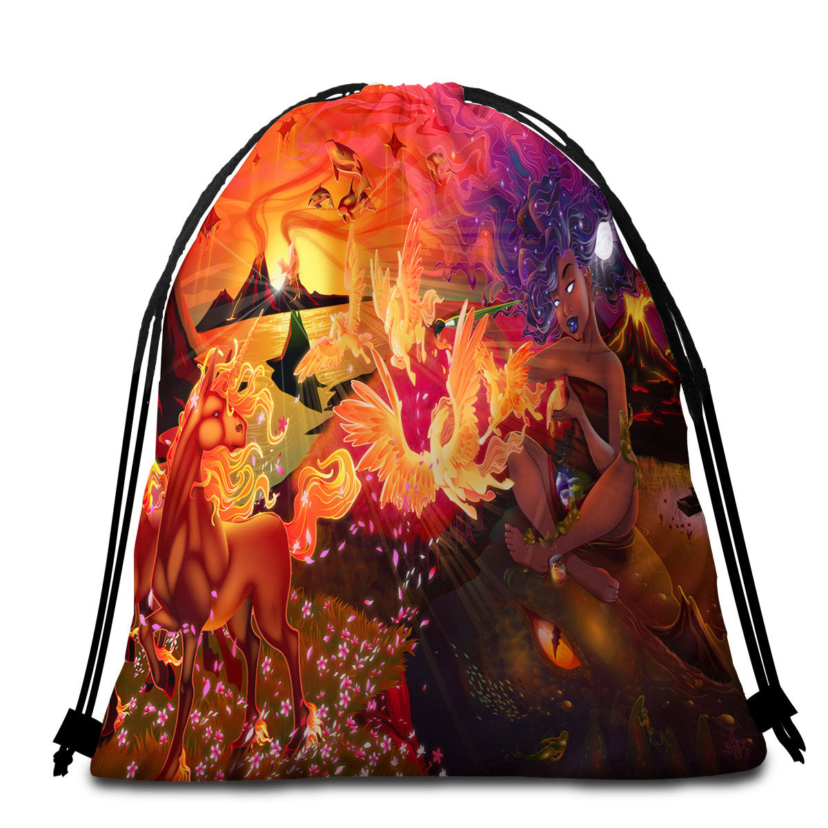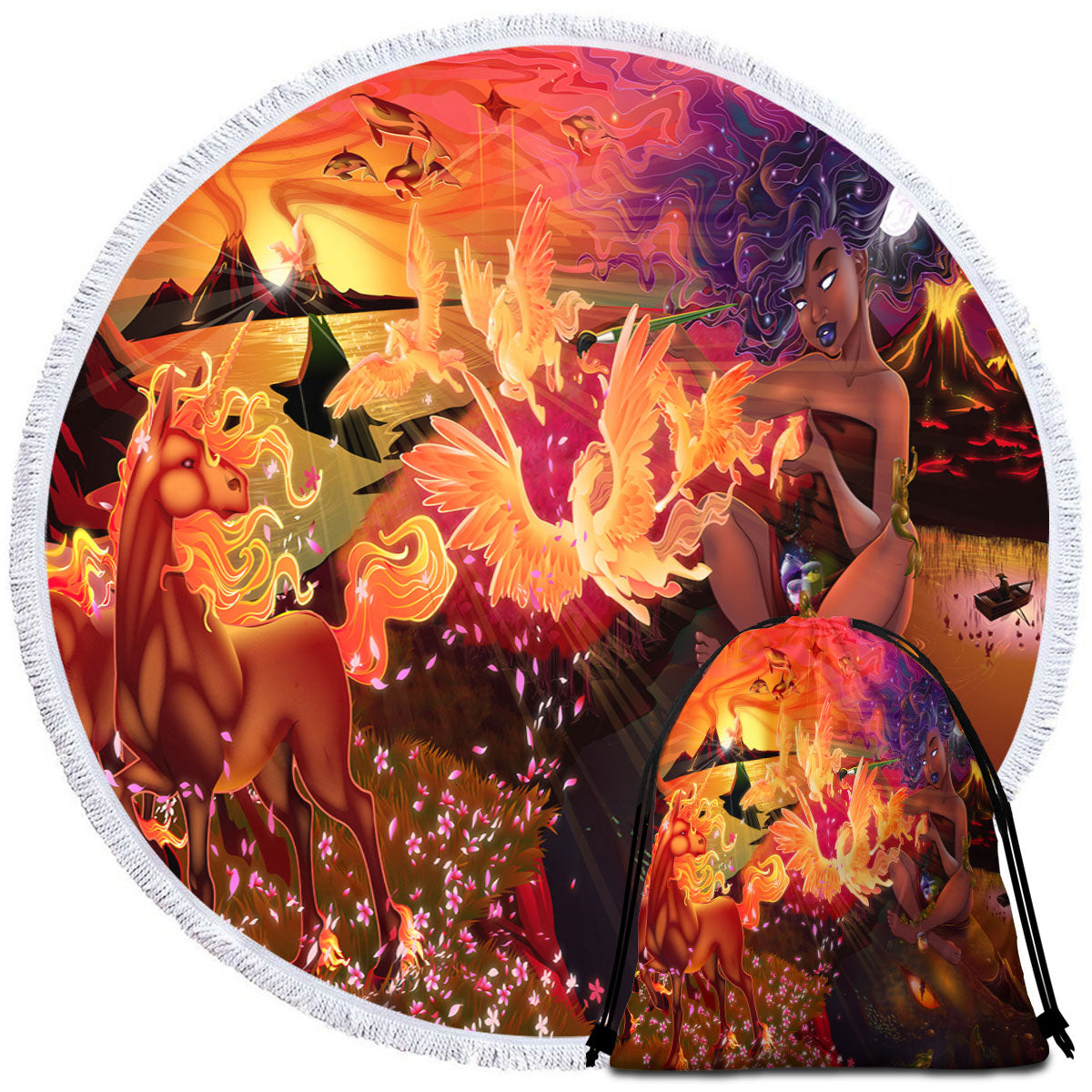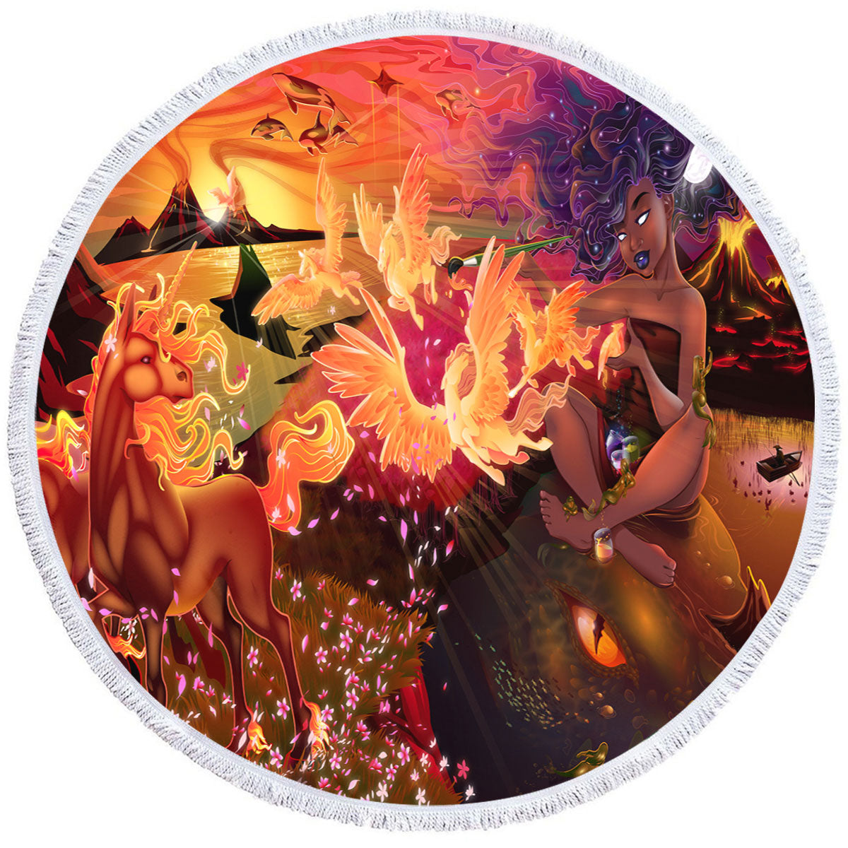 Fantasy Art Unicorn Pegasus Volcanoes and Beautiful Artist Round Beach Towel