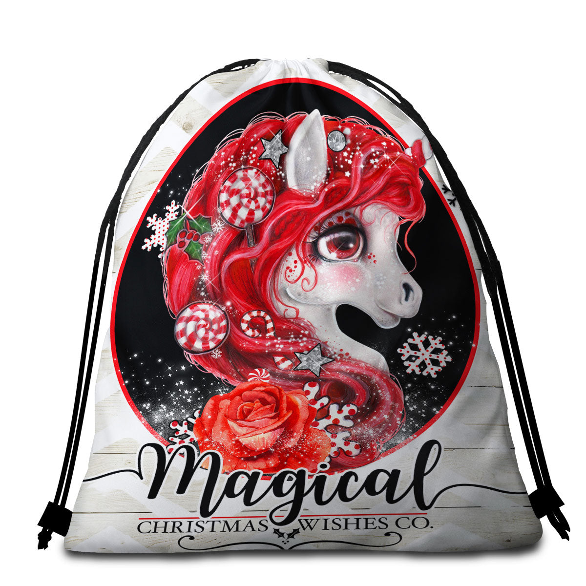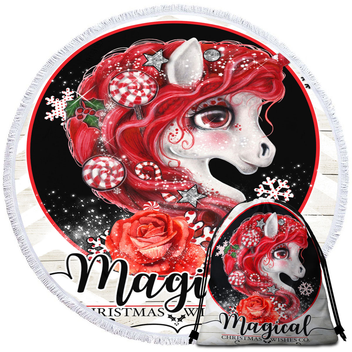 Fantasy Christmas Peppermint Unicorn Round Beach Towel