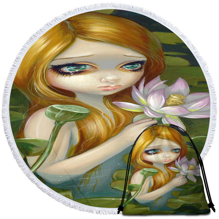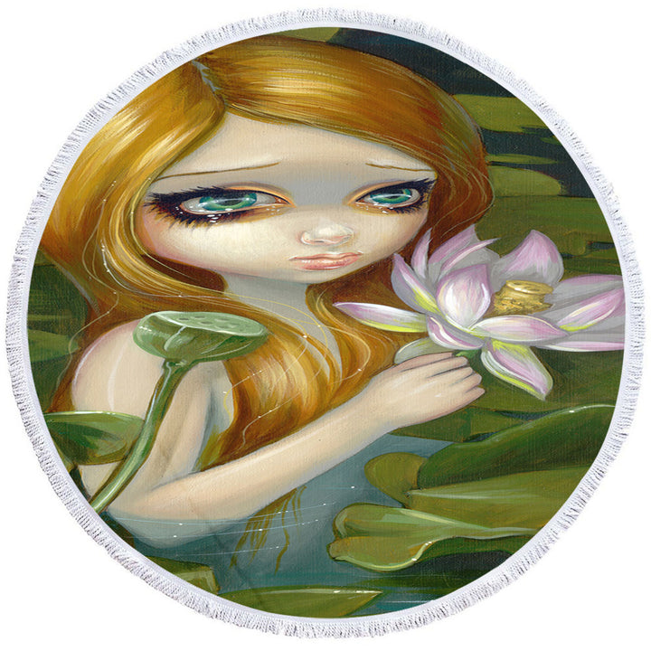 Fantasy Painting Mermaid Picking Lotus Blossoms Round Beach Towel