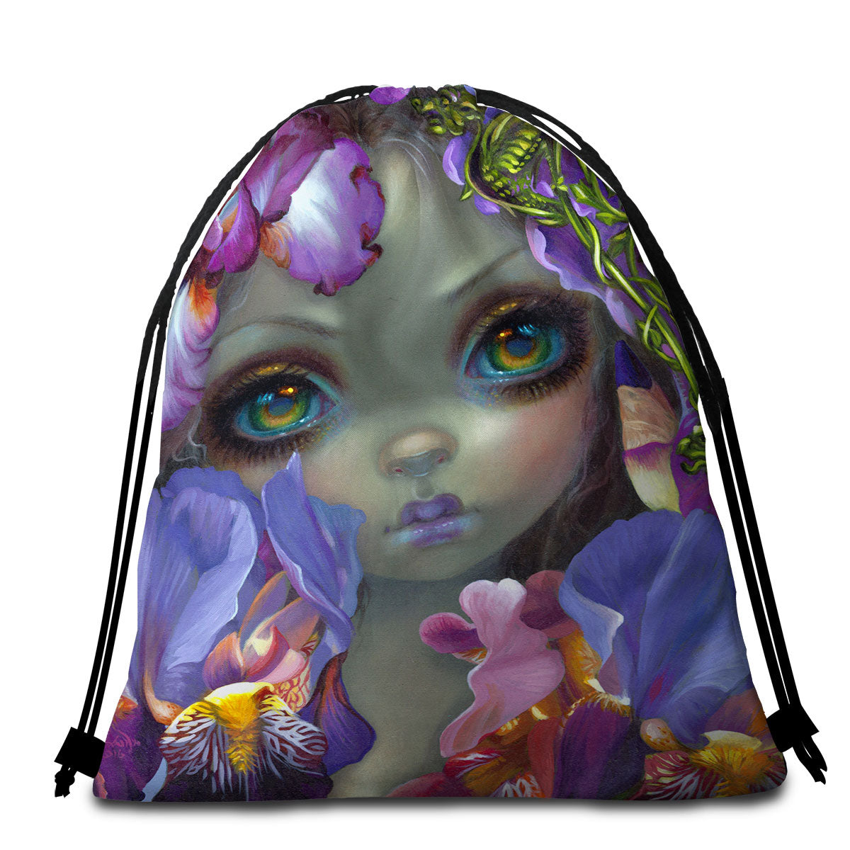 Fine Art the Language of Flowers Irises Girl Round Beach Towel