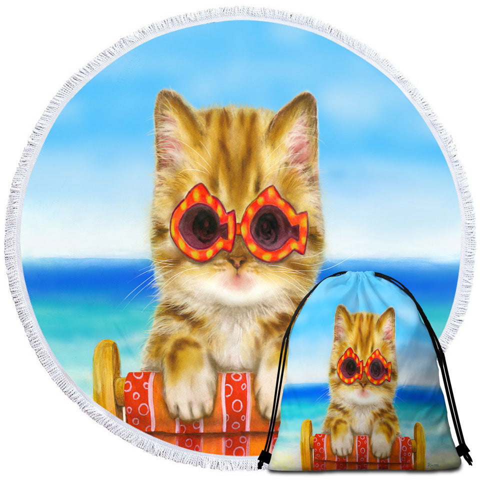 Funny Cats Ginger Tabby Kitten at the Beach Round Beach Towel