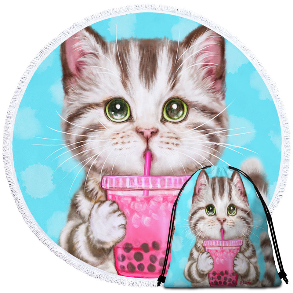 Funny Kittens Adorable Grey Tabby Cat Enjoying Tea Round Beach Towel