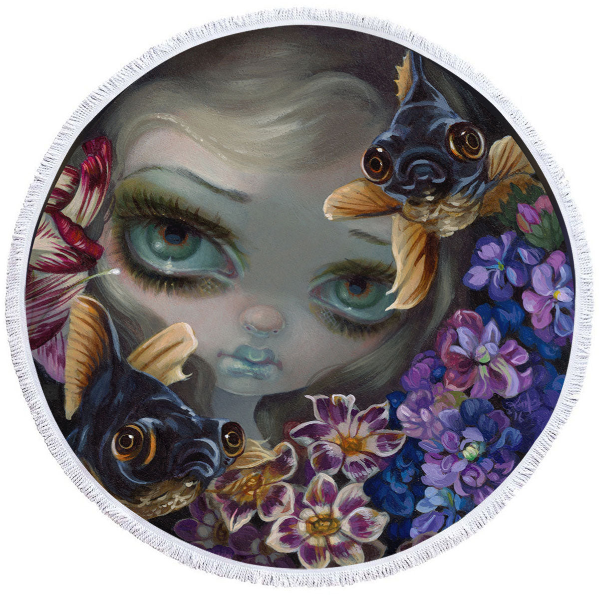 Girl and Fish Black Moor Porthole Round Beach Towel
