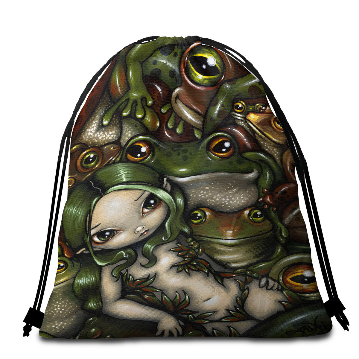 Green Haired Nature Girl Bed of Frogs Round Beach Towel