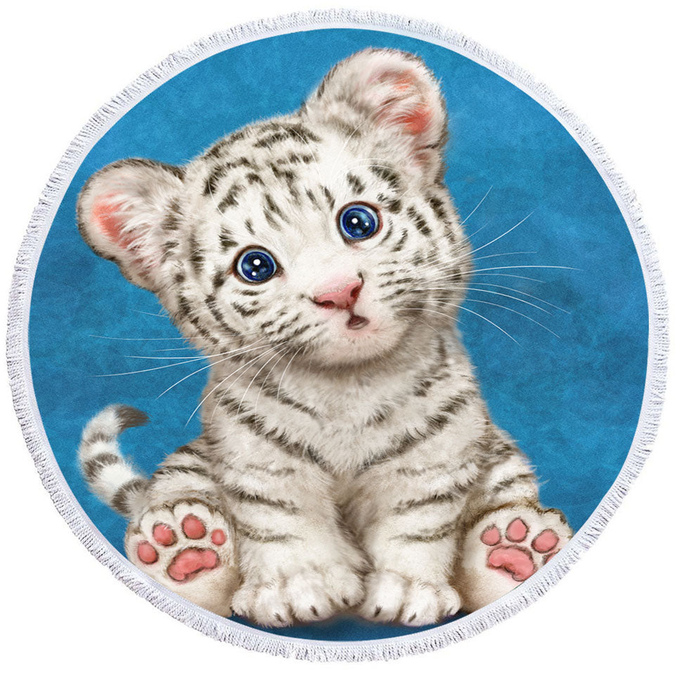 Kids Design Baby Blue Eyes White Tiger Cub Round Beach Towel