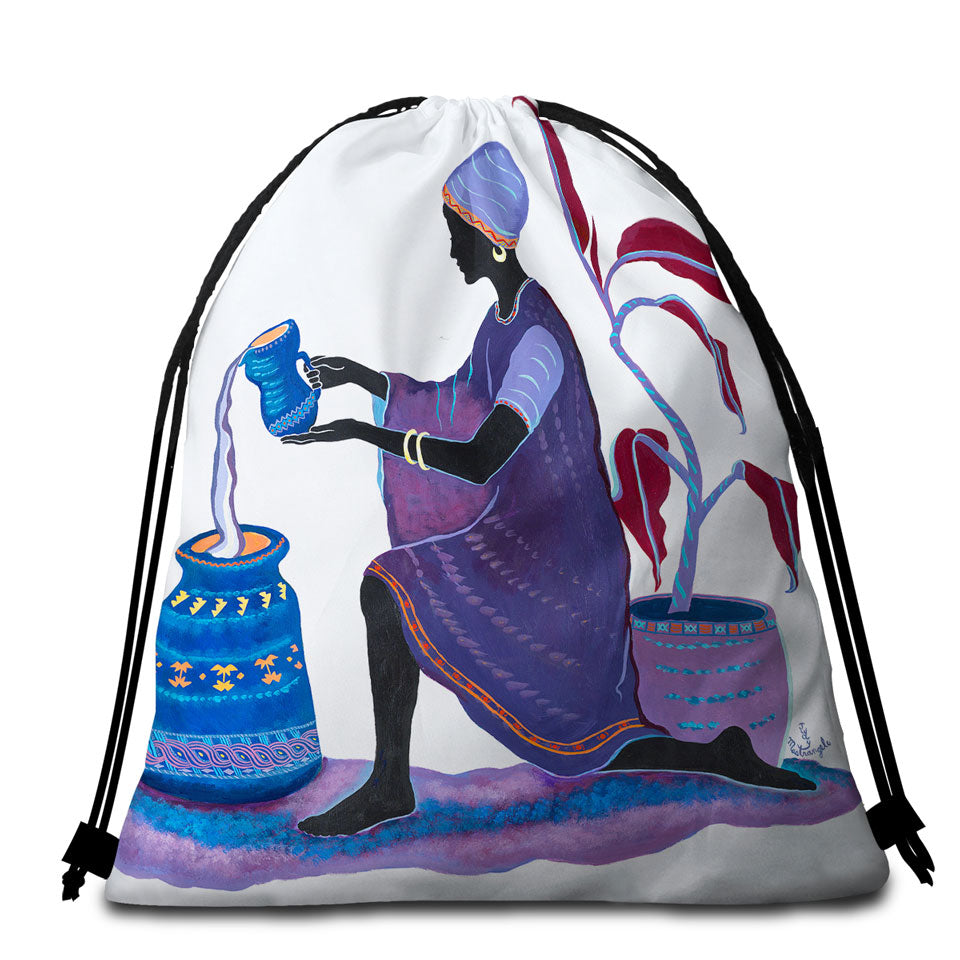 Kneeling in Purple Dress African Art Painting Woman Round Beach Towel
