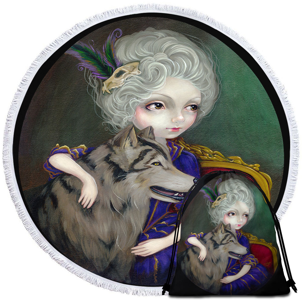 Loup Garou Big Eyed Beautiful Girl and Her Wolf Round Beach Towel
