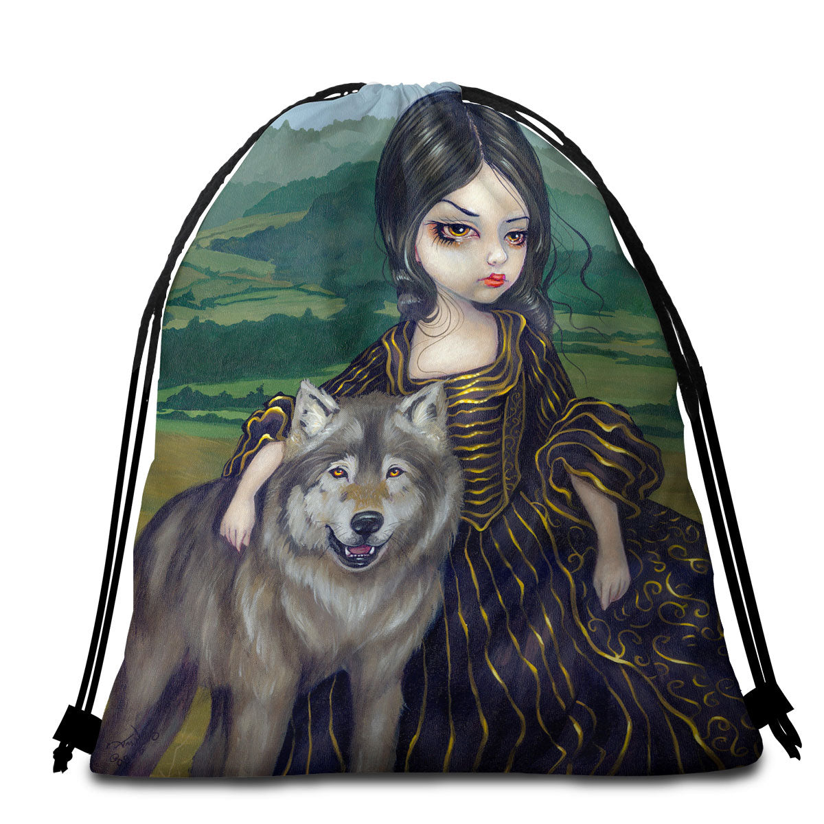 Loup Garou Fine Art Landscape Wolf and Lady Round Beach Towel