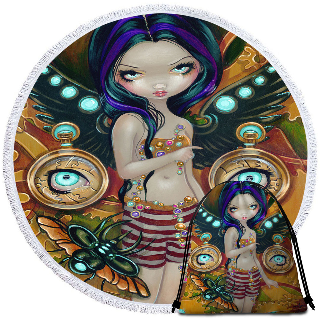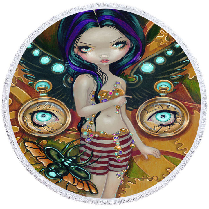 Mechanical Angel Steampunk Glowing Eyes Girl Round Beach Towel