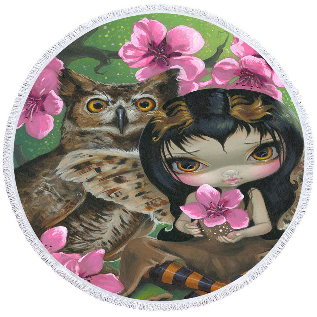 Owl Fairy Owlyn in the Springtime Cherry Blossom Round Beach Towel