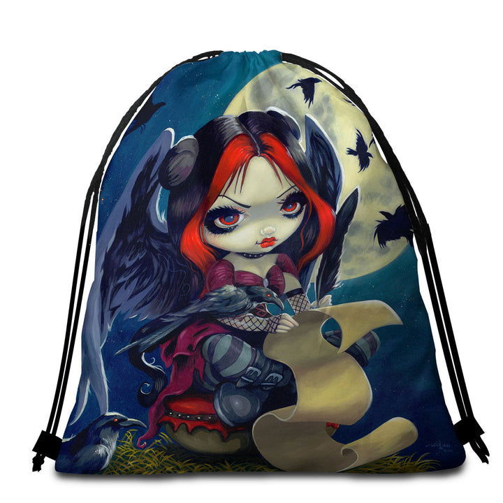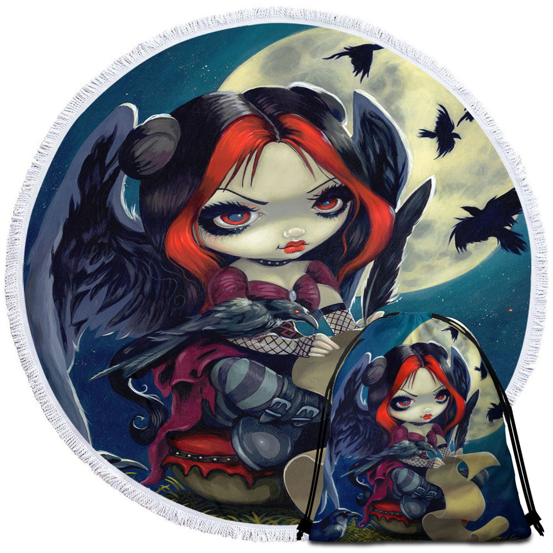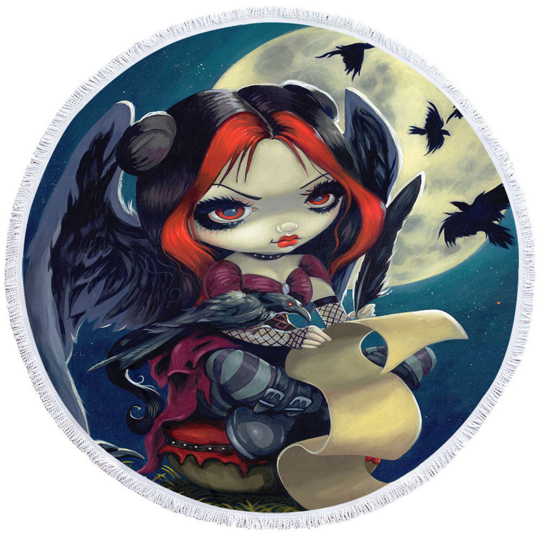 Poe The Raven Gothic Girl with Wings at Night Round Beach Towel