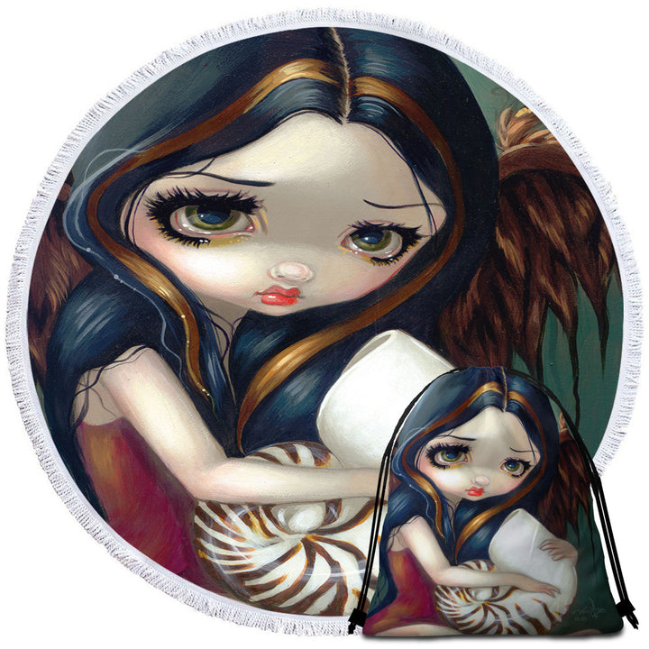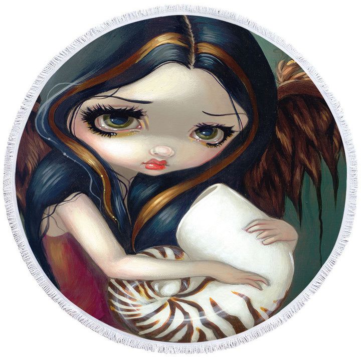 Sad Eyed Beautiful Girl Angel and Nautilus Shell Round Beach Towel
