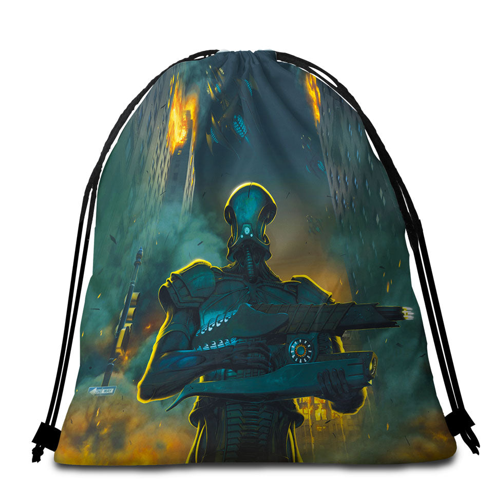 Science Fiction Art Robots City Invasion Round Beach Towel