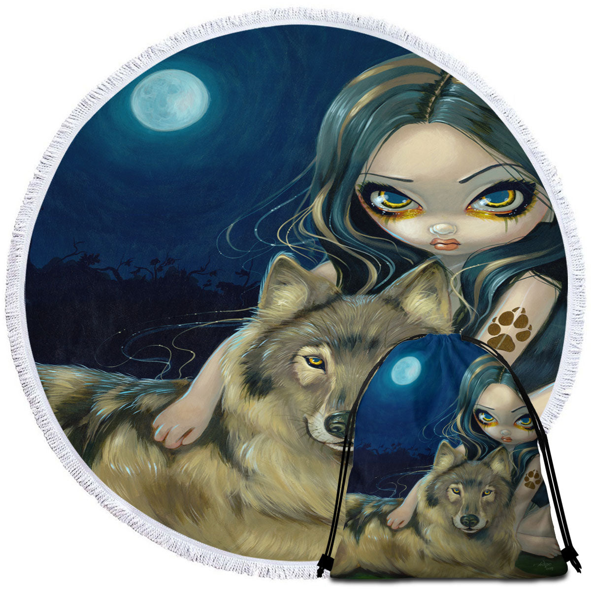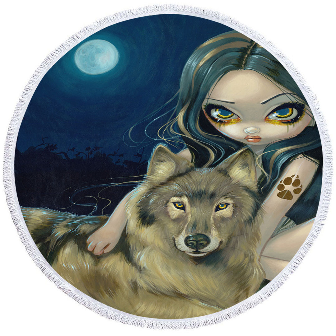 Wolf Moon Beautiful Girl Sitting with Her Wolf Round Beach Towel