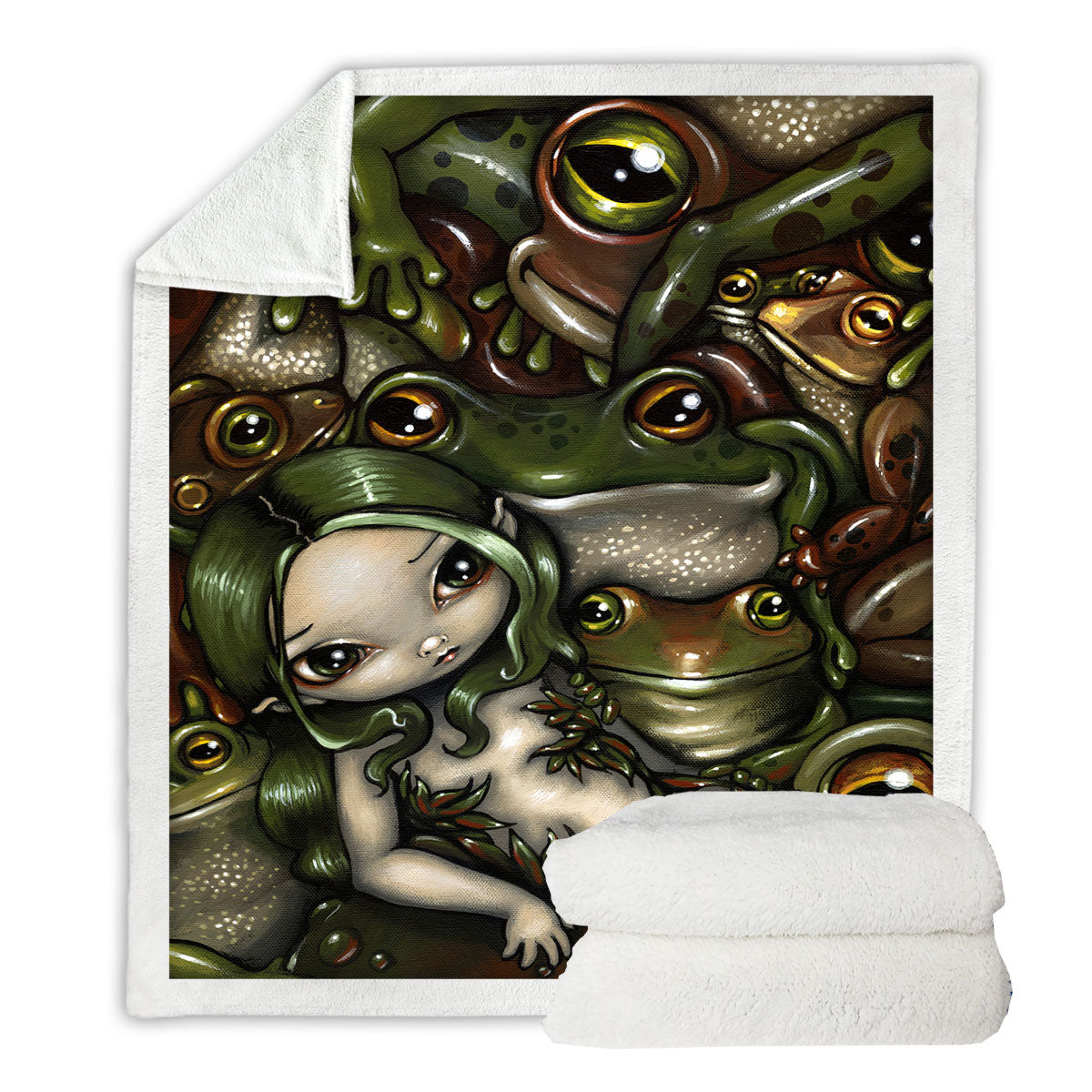 Green Haired Nature Girl Bed of Frogs Throw Blanket