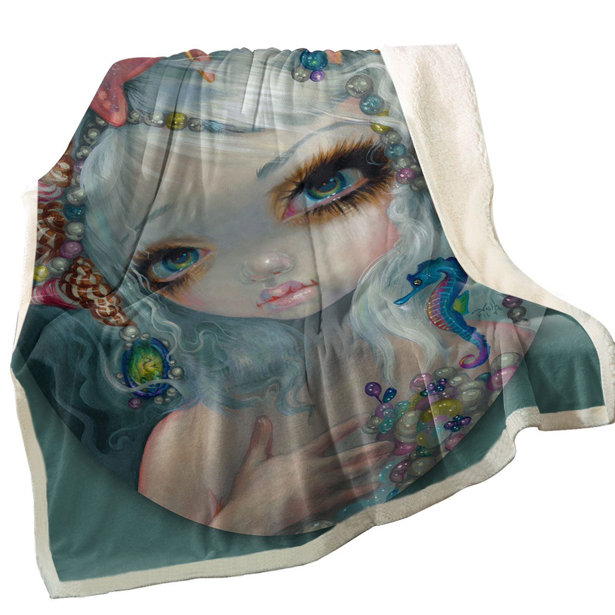 Seashell Princess Beautiful Doe Eyed Mermaid Throw Blanket