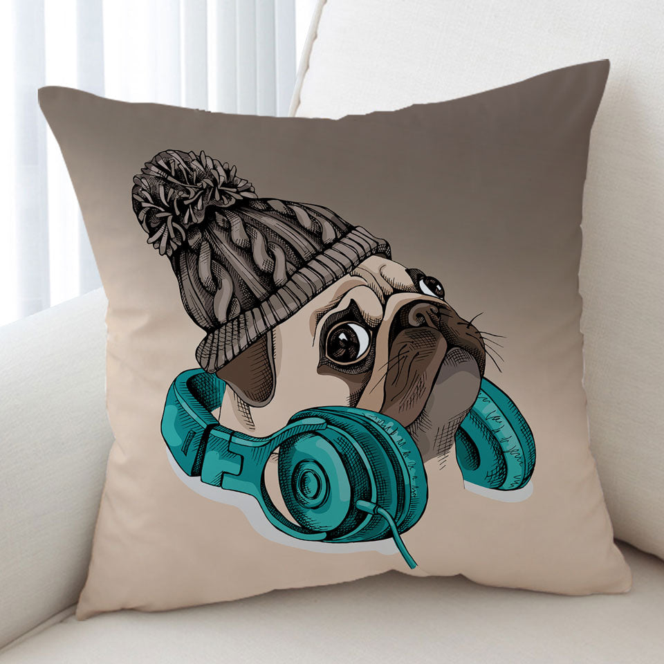 Cool Winter Pug Wearing Headphones Throw Pillow