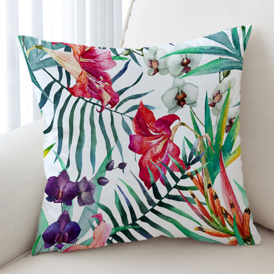 Purple White Orchid and Red Hibiscus Flowers Throw Pillow
