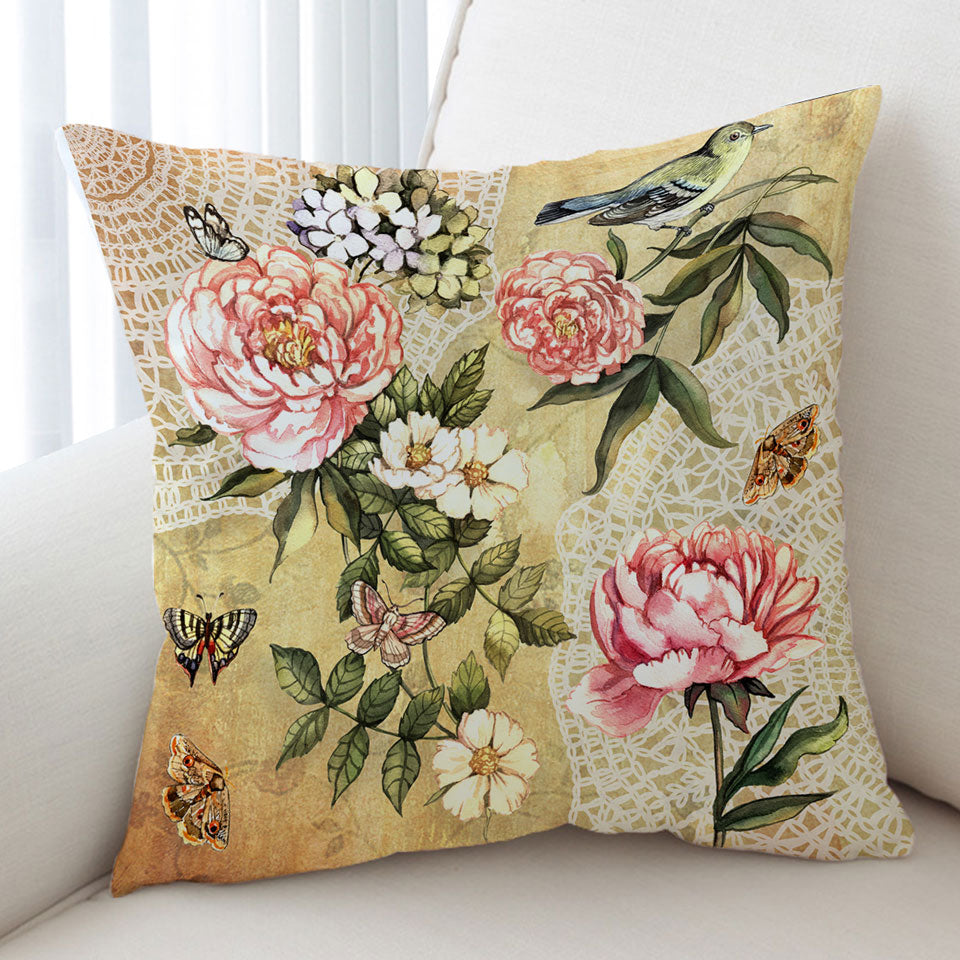 Vintage Flowers Bird and Butterflies Throw Pillow