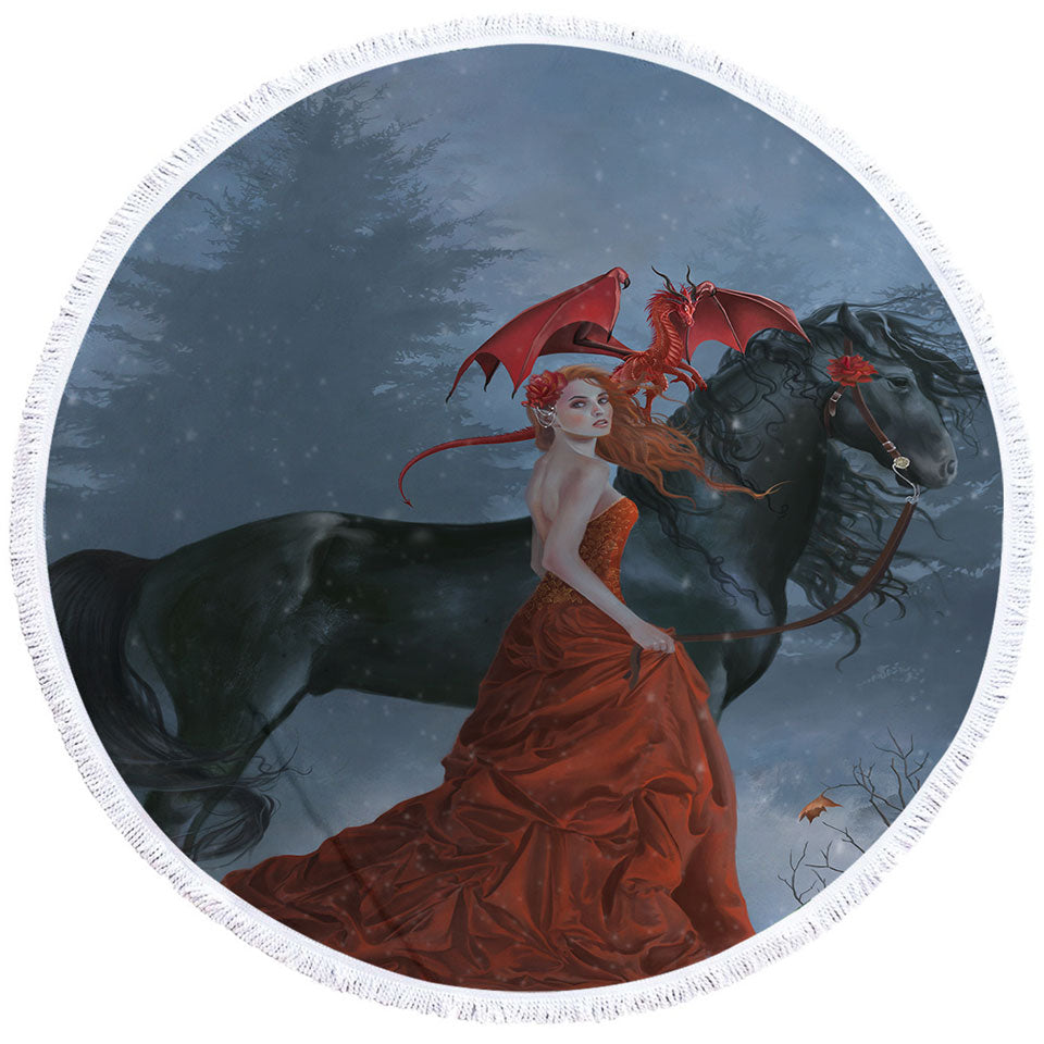 Fantasy Art Beautiful Autumn Dragon Princess with Her Horse Round Beach Towel