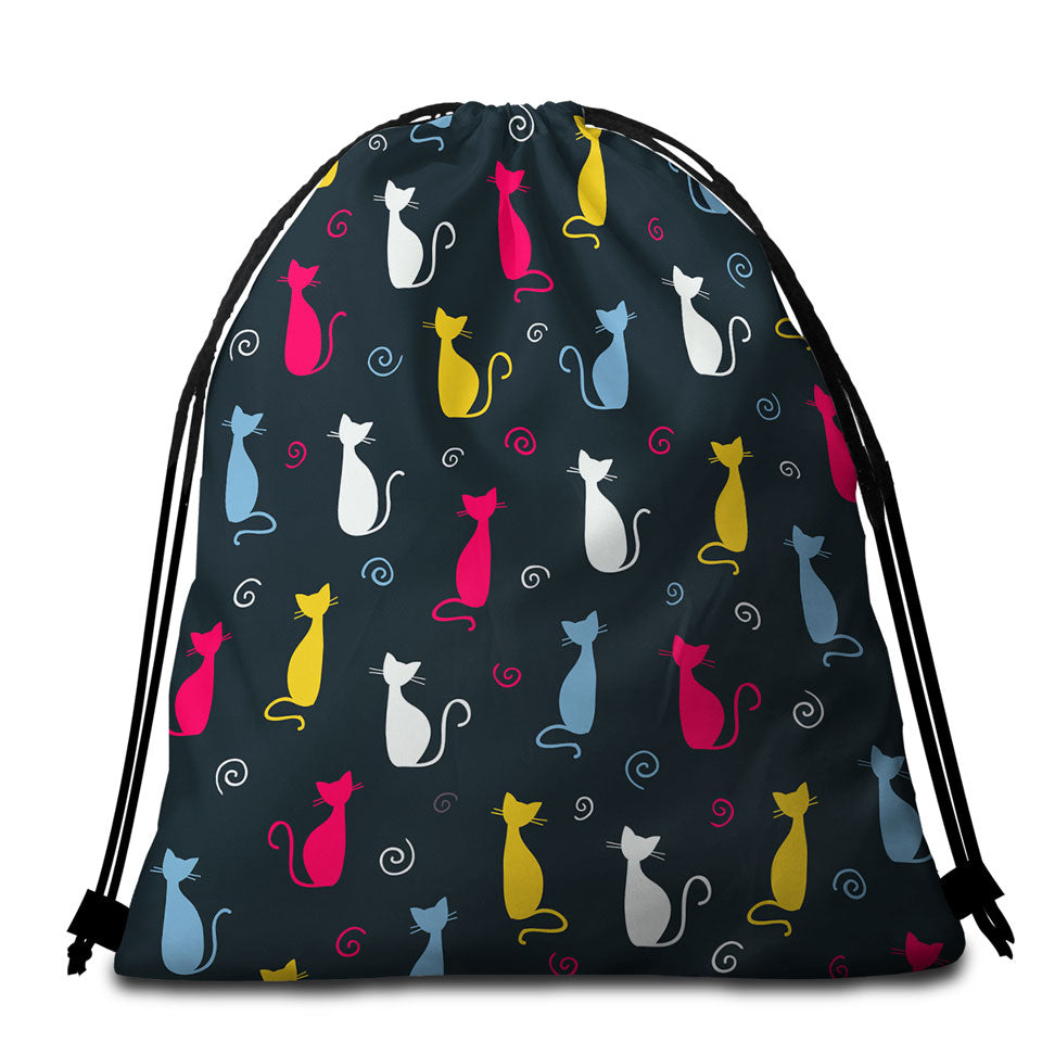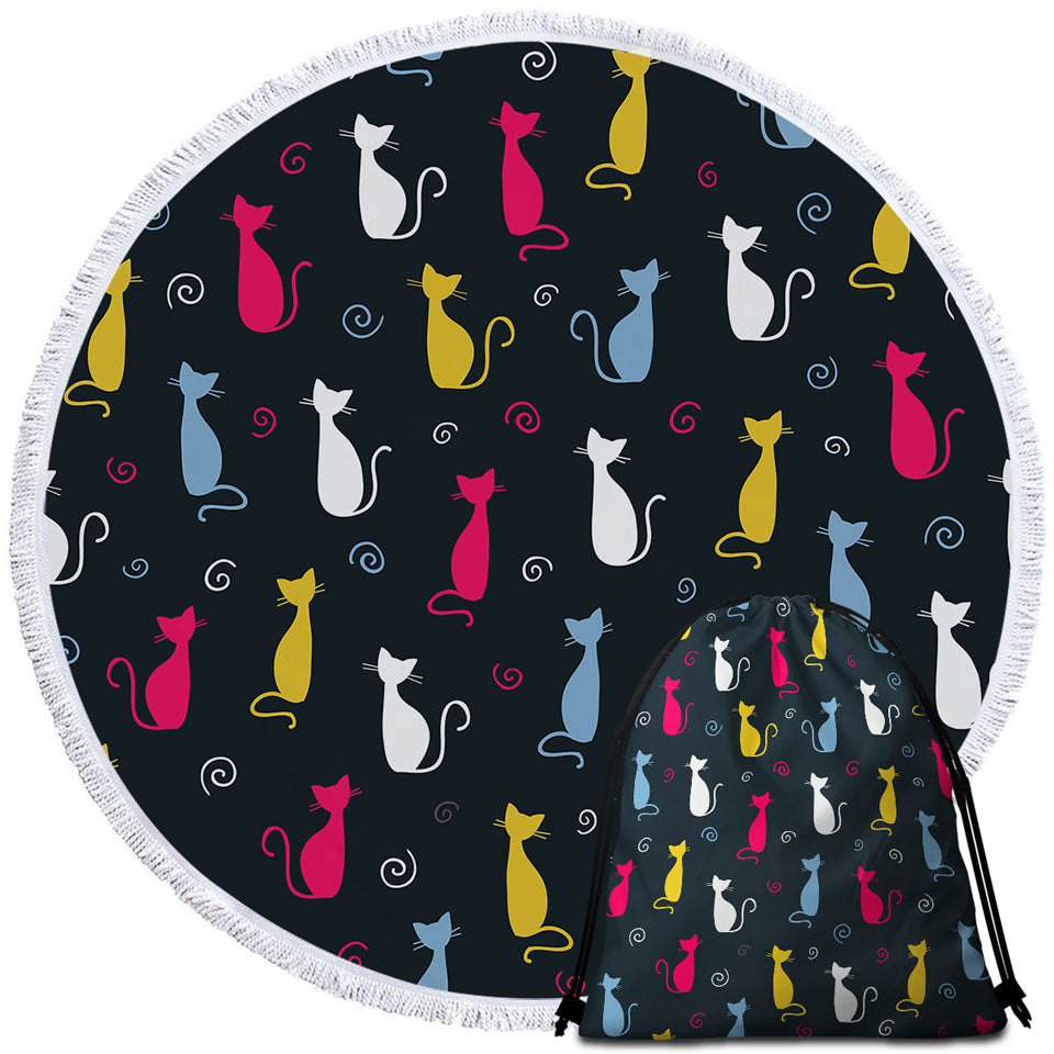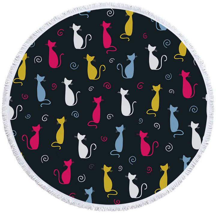 White Yellow Blue Pink Cats Round Beach Towel